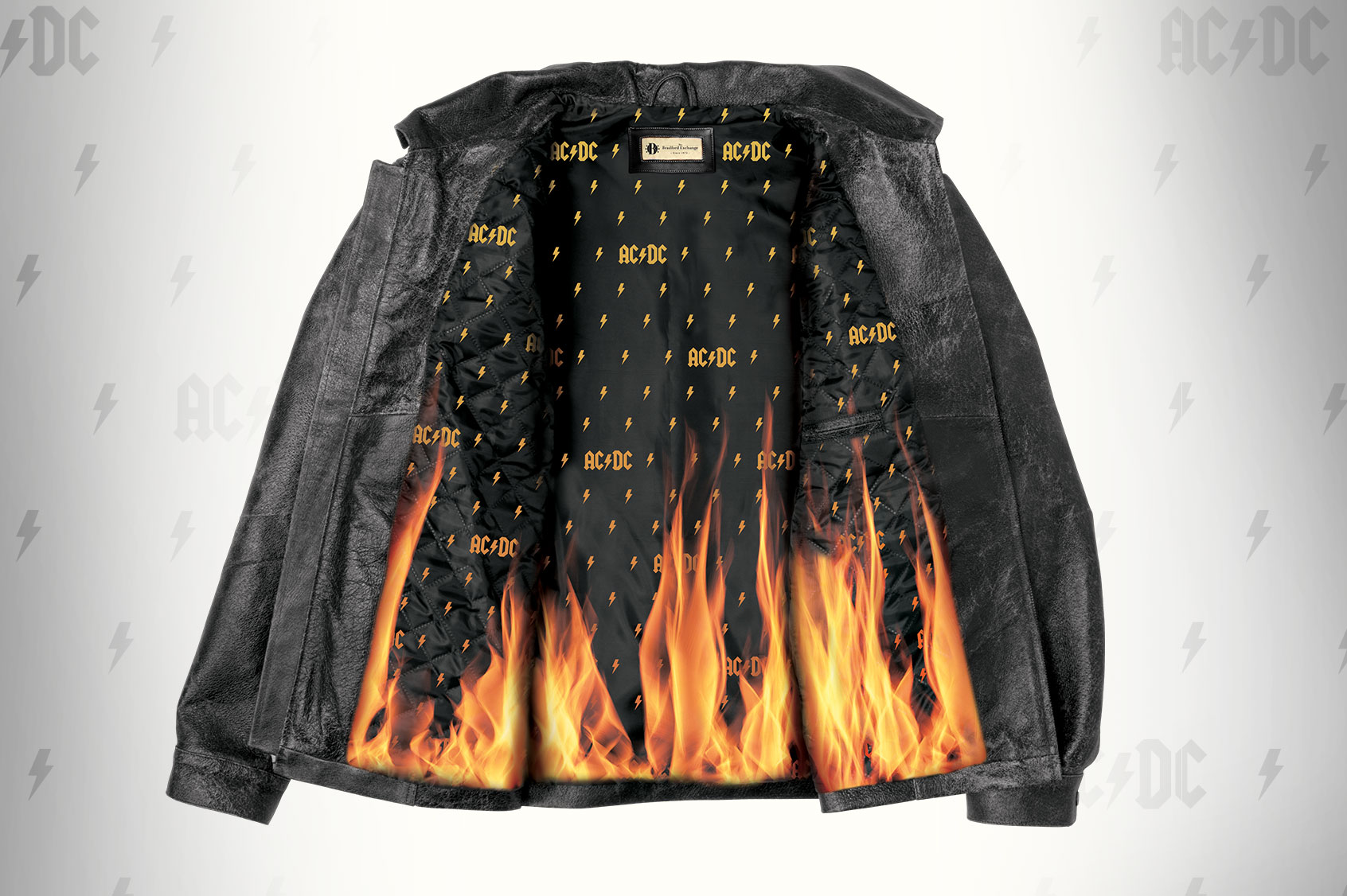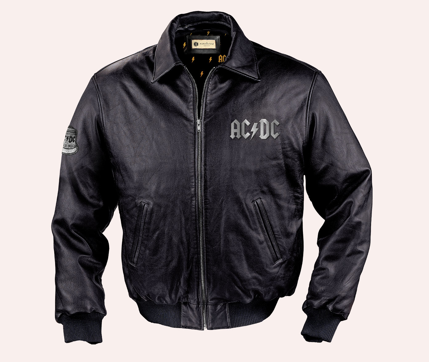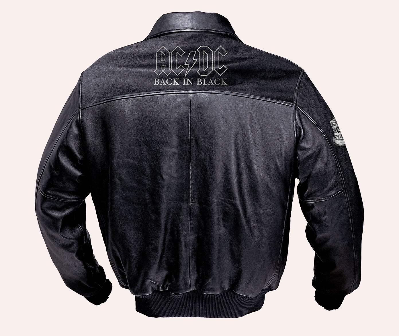 Officially licensed AC/DC leather jacket created as a tribute to Back In Black, combining rugged materiality with hidden storytelling details. Developed while working at The Bradford Exchange.