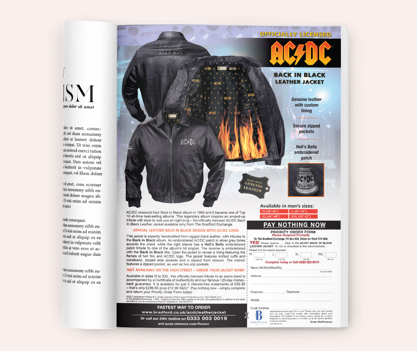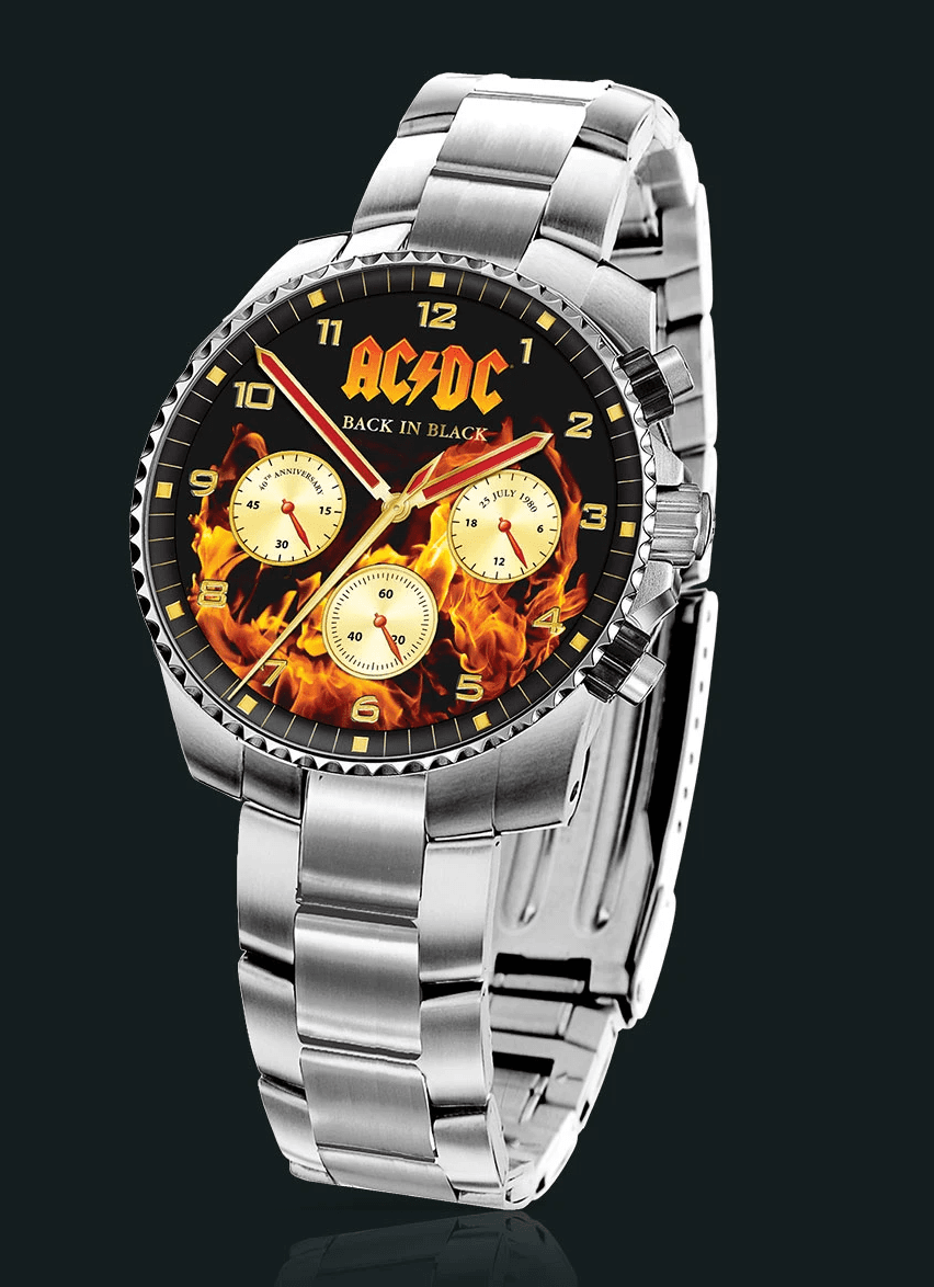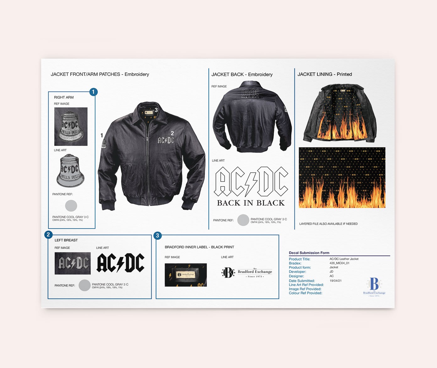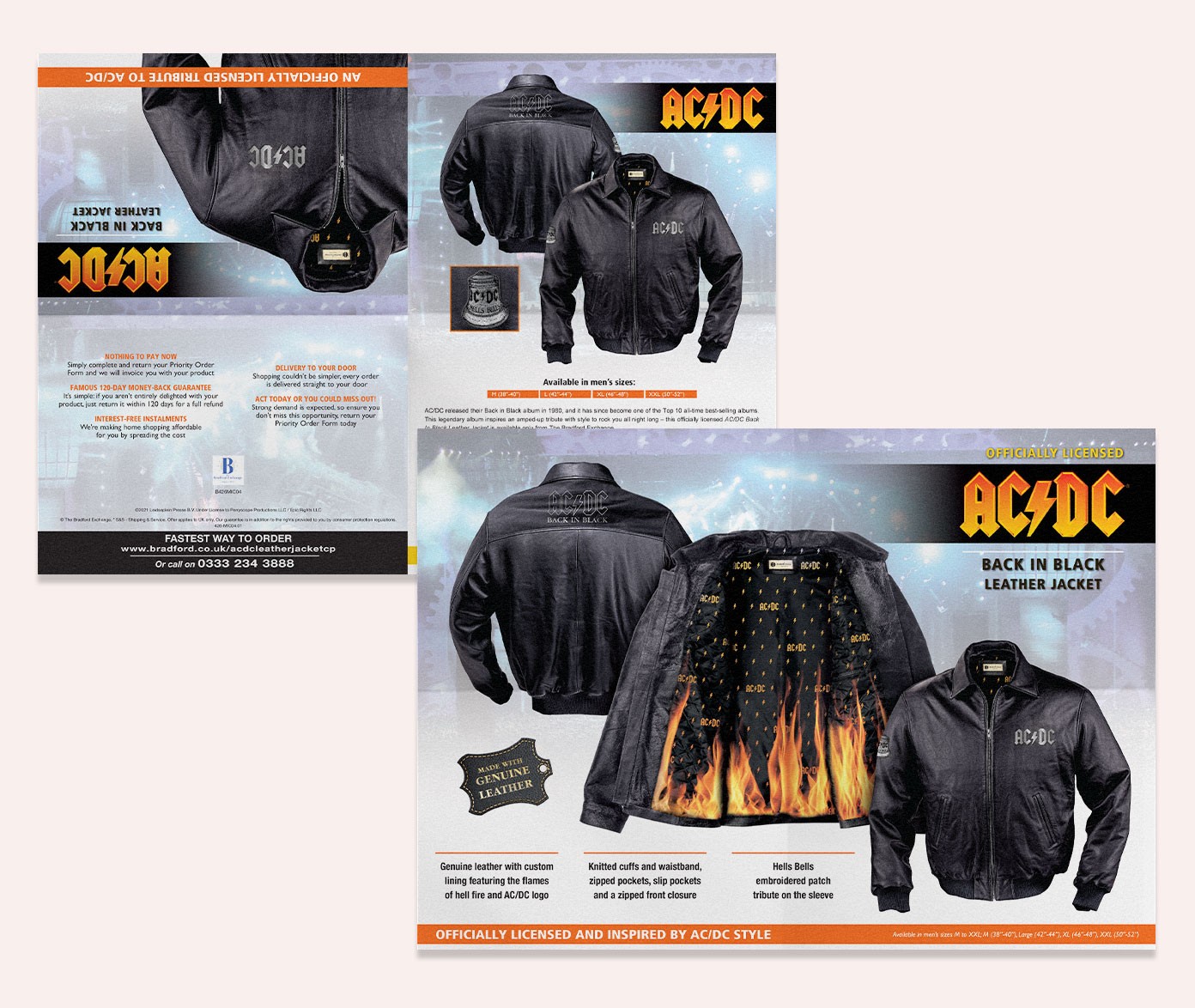 Officially licensed AC/DC leather jacket created as a tribute to Back In Black, combining rugged materiality with hidden storytelling details. Developed while working at The Bradford Exchange.